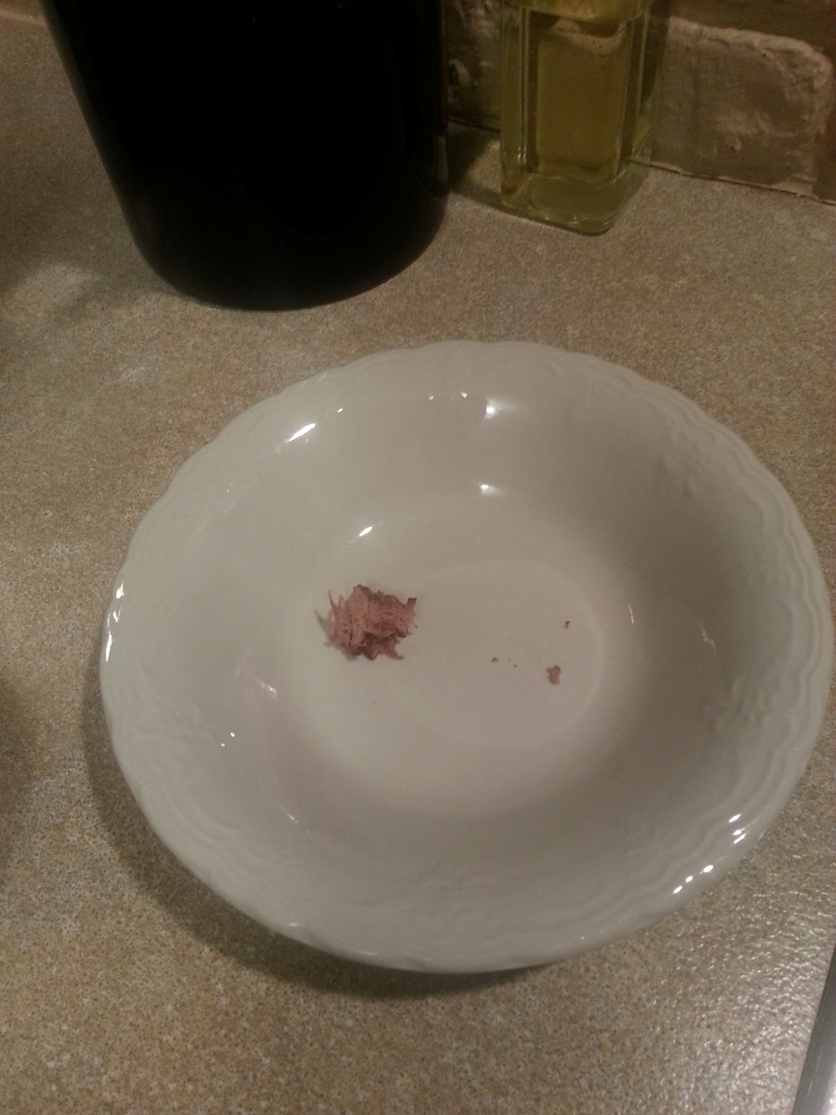 He came down to join Gary and I for supper, and of course had to get more silverware, the napkins, the toothpicks - you know the routine as well as we do by now. And as he cut his steak, he placed something in his unused salad bowl. It was a piece of fat that he had cut from his steak. The fat could not stay on his plate, just like crumbs cannot stay in the same bowl or plate as his chips or crackers or whatever. One little piece of fat - but it's too much to share the plate with his good food.